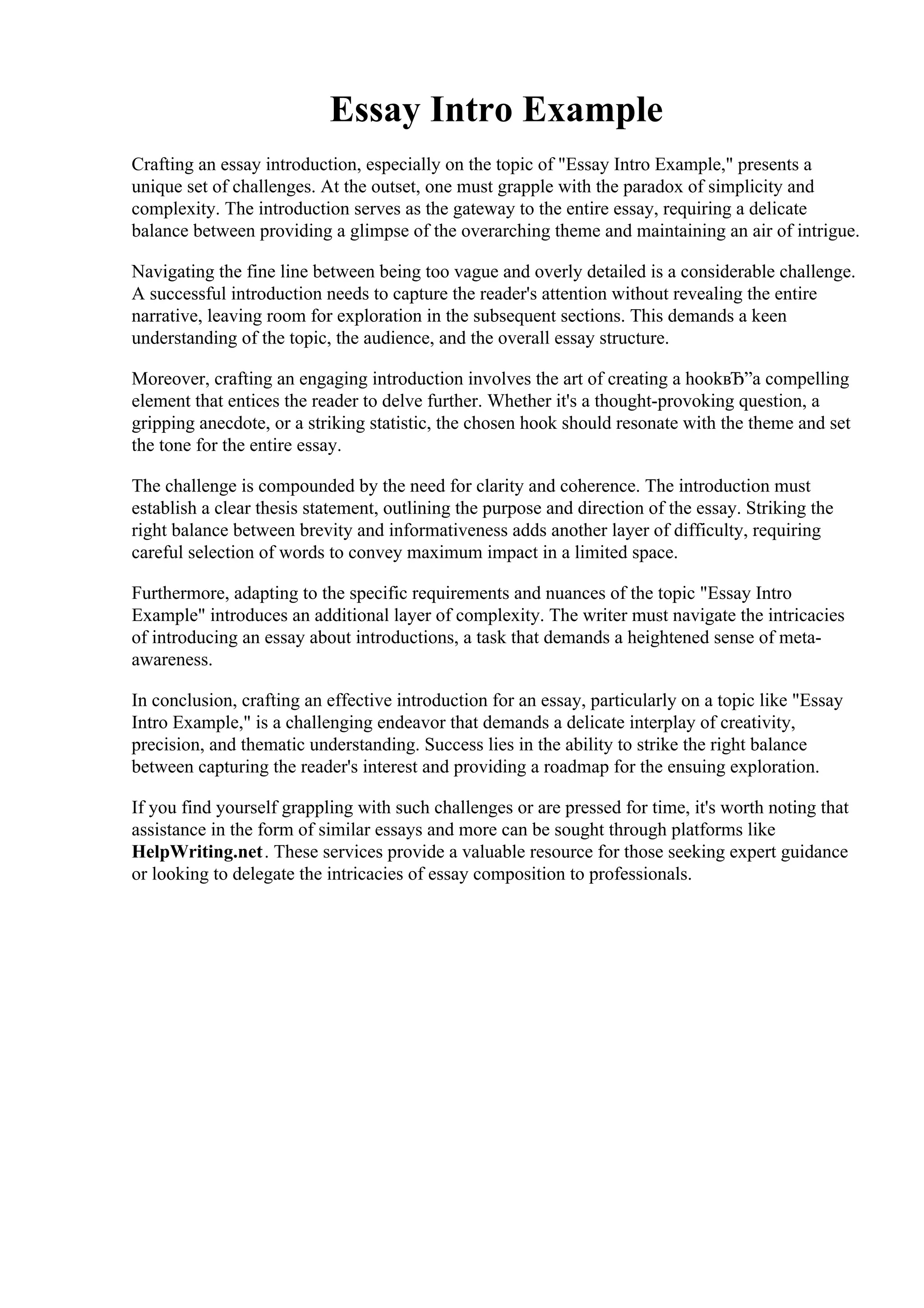 Crafting an effective essay introduction, especially on the topic of 'essay intro example', requires a balance of intrigue and clarity, capturing the reader's attention while outlining the thesis. The introduction must navigate the complexities of engaging the audience without revealing too much, necessitating a strong hook and a clear structure. Ultimately, the process demands creativity, precision, and a deep understanding of the topic at hand.