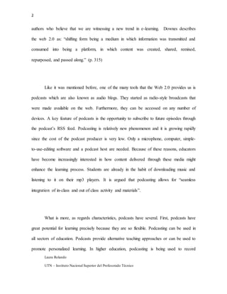 The document discusses using podcasts to improve English language learners' speaking skills. It notes that many institutions cannot provide sufficient speaking practice. Podcasts offer opportunities for practice outside the classroom through listening to recordings. The document then describes a website called Splendid Speaking that developed podcasts featuring sample speaking exam tasks. Learners could listen to improve their skills and confidence for exams. The podcasts proved popular for exam preparation. Overall, the author argues that podcasts can help engage students and provide valuable speaking practice to improve their skills.