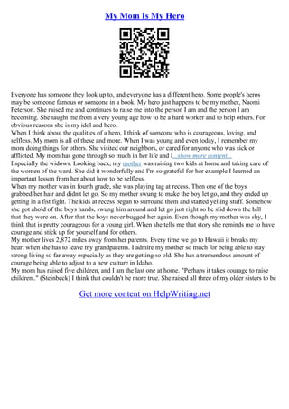 The document celebrates the author's mother as a hero and role model who embodies courage, selflessness, and dedication. It reflects on the mother's hard work in raising her children, managing personal struggles, and supporting others in the community. Through various anecdotes, the author illustrates the deep appreciation and love for their mother, highlighting her influence on their values and character.