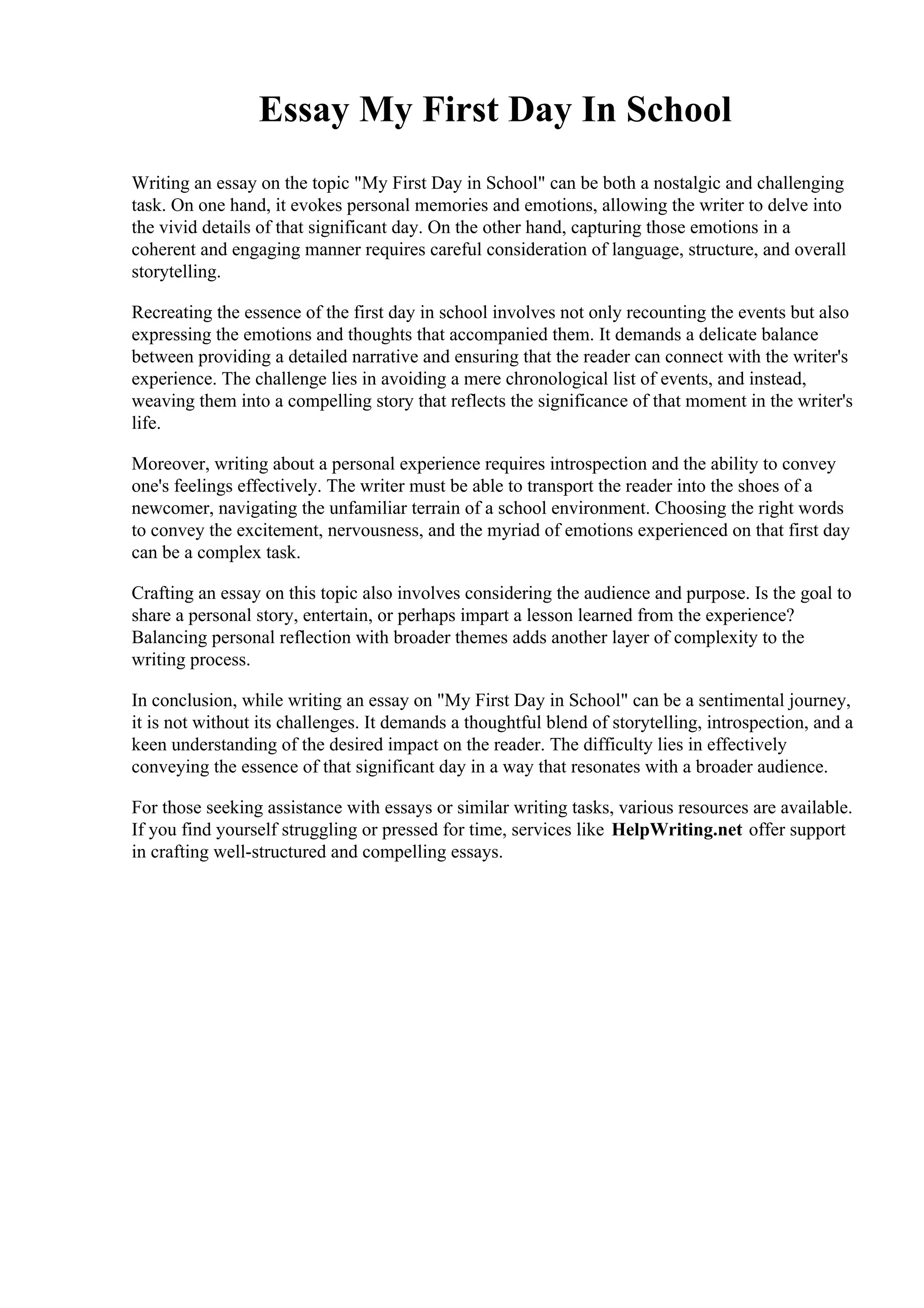 The document discusses the challenges of writing an essay about one's first day of school. It notes that while recalling personal memories and emotions can be nostalgic, effectively conveying those experiences through coherent storytelling, balanced narrative, and evoking the reader's connection requires careful consideration. The essay must avoid simply listing events and instead weave them into a compelling story that reflects the experience's significance. It also must transport the reader to feel what it was like navigating an unfamiliar school environment for the first time through well-chosen words expressing excitement, nerves, and other emotions. Additionally, the writer needs to contemplate the audience and purpose of sharing either a personal story, entertainment, or imparting a lesson learned.
