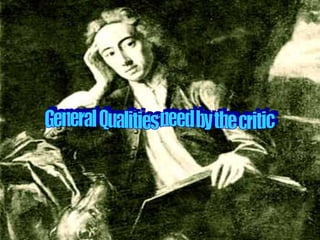 This document provides an overview and analysis of Alexander Pope's 1711 poem "Essay on Criticism". It summarizes the poem's main ideas in three parts. First, it discusses the general qualities needed by a critic, including self-awareness, knowledge of nature, and imitation of ancient works. Second, it outlines the particular laws for criticism, such as considering a work as a total unit and seeking the author's aim. Third, it describes the ideal characteristics of good critics, including integrity, modesty, and using ancient critics like Aristotle and Horace as models.