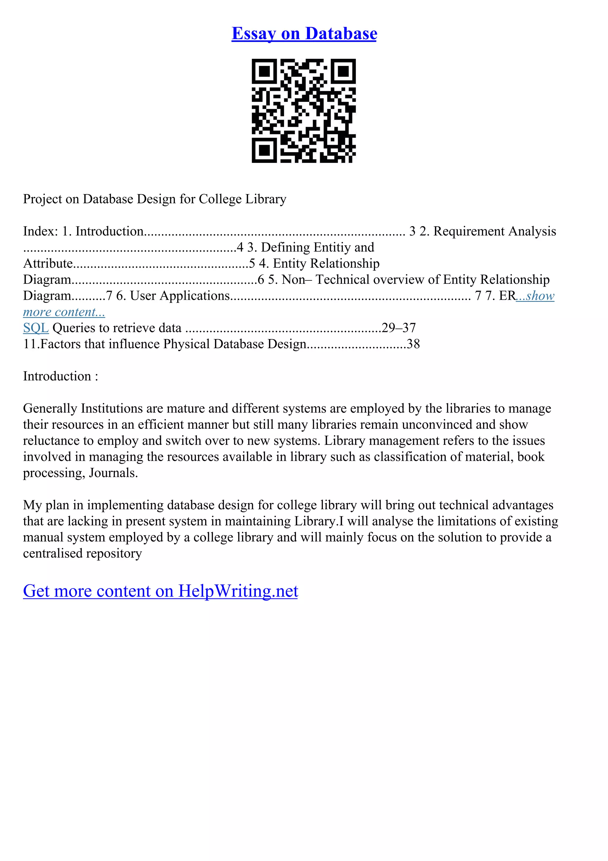 This document discusses a database design project for a college library, emphasizing the need for improved management of resources and the limitations of existing manual systems. It outlines key components such as requirement analysis, entity relationship diagrams, and user applications. The goal is to create a centralized repository that enhances efficiency in library operations.