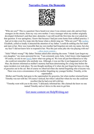 The document discusses dementia, a prevalent condition among older adults characterized by cognitive decline, including memory loss and impaired reasoning. It examines various forms of dementia, such as Alzheimer's and vascular dementia, detailing symptoms, causes, and risk factors while emphasizing the importance of nursing assessments and interventions. Additionally, the document offers personal narratives illustrating the impact of dementia on individuals and their families.