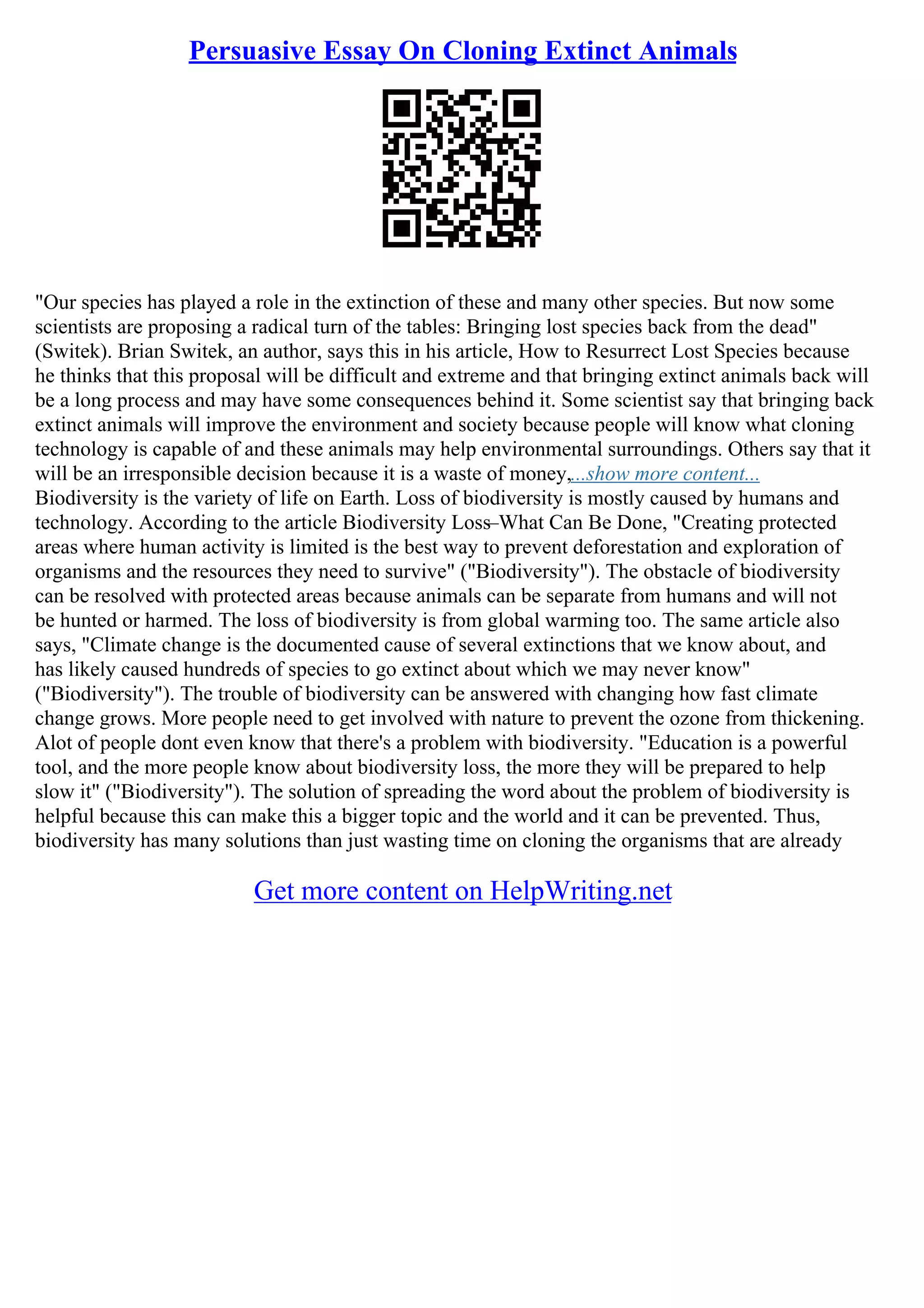 The document discusses the controversial topic of cloning extinct animals, emphasizing the human-driven causes of extinction and the potential consequences of de-extinction projects. While some scientists argue that reviving lost species may enhance biodiversity and public understanding of cloning technology, others caution against the risks and ethical concerns, advocating instead for the conservation of currently endangered species. Ultimately, the text highlights the urgent need for awareness and action to prevent habitat loss and environmental degradation contributing to the ongoing extinction crisis.
