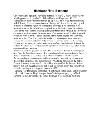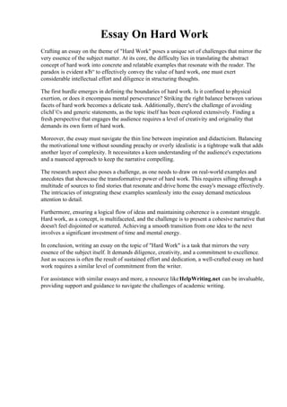 The document discusses the challenges of writing an essay on the theme of hard work, emphasizing the need for original thought, creativity, and effective structure to engage readers. It also covers various topics including the impact of Hurricane Floyd, a literary analysis of Amy Lowell's poem, the effects of air pollution, and the significance of virtuous leadership in combating negative work environments. The overarching theme connects the necessity of effort and diligence in both writing and real-life situations.
