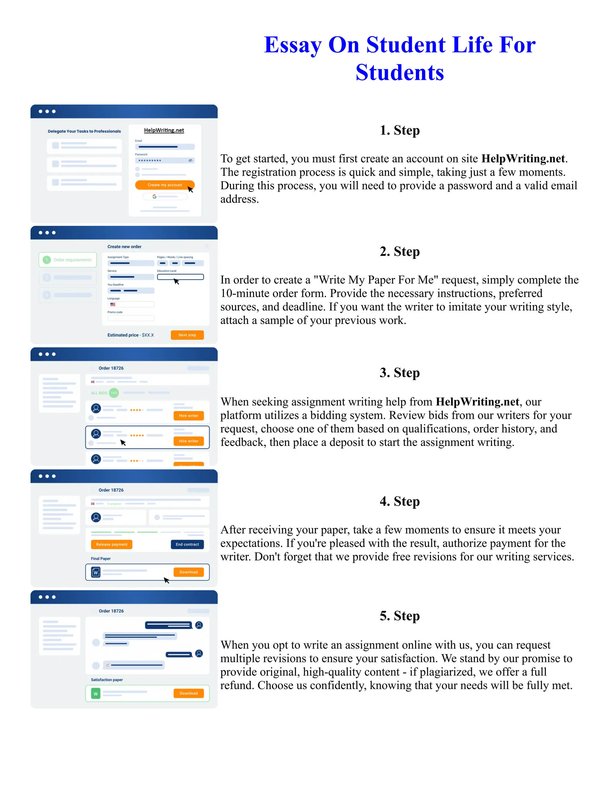 The document provides instructions for students to get writing help from HelpWriting.net. It outlines a 5-step process: 1) Create an account with an email and password. 2) Complete a 10-minute order form providing instructions, sources, and deadline. 3) Review bids from writers and choose one based on qualifications. 4) Review the completed paper and authorize payment if satisfied. 5) Request revisions to ensure satisfaction, with a full refund option for plagiarized work.