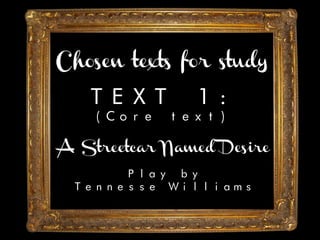 This document contains an essay proposal and outline comparing the presentation of transgressive behavior leading to the downfall of characters in three works: A Streetcar Named Desire by Tennessee Williams, Lolita by Vladimir Nabokov, and Miss Julie by August Strindberg. It lists the chosen texts, themes of desire, destruction, and morality. The proposed essay title and 6 points are provided with brief examples and references from each text to support each point. The points discuss fate fueling desires, women as instigators of transgressive acts, characters' blindness to such acts, desire as the root cause, women's acts seen as more serious, and social influence on downfalls.