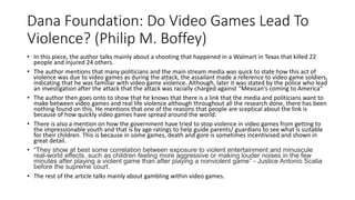 This document summarizes several sources that discuss the relationship between video games and real-world violence. The sources indicate that while some politicians and media claim video games cause violence, extensive research studies have found little to no evidence to support this link. Some studies find only a very small correlation between aggression and video games that does not meet the threshold for harmful behavior. The sources suggest other factors like mental illness and access to guns are more strongly associated with mass shootings than video game play.