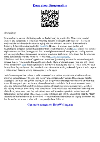 Structuralism analyzes social relationships in terms of abstract relational structures and patterns of thought. Claude Levi-Strauss pioneered structuralism, suggesting that cultural phenomena like myths display ordered patterns that reveal the structure of the human mind. He argued that culture is a surface phenomenon that reveals the universal human tendency to order and classify experiences unconsciously through rules like language. When choosing a business structure, owners must consider liability, taxation, and legal protections of different forms like sole proprietorships, general partnerships, corporations, and LLCs to structure their business efficiently based on these factors.