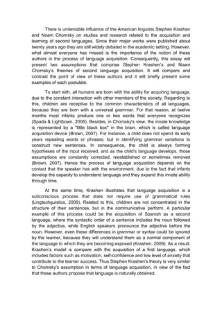 This document provides an overview and comparison of Stephen Krashen and Noam Chomsky's theories of second language acquisition. Both theorists propose that language is acquired naturally and that humans are born with an innate ability to learn language. However, they differ on some key points. Krashen believes language is acquired subconsciously, following a natural order of difficulty, whereas Chomsky argues there is a critical period for language acquisition in infancy/adolescence. The document also discusses factors like motivation, environment, and age that influence the language acquisition process according to these theorists.