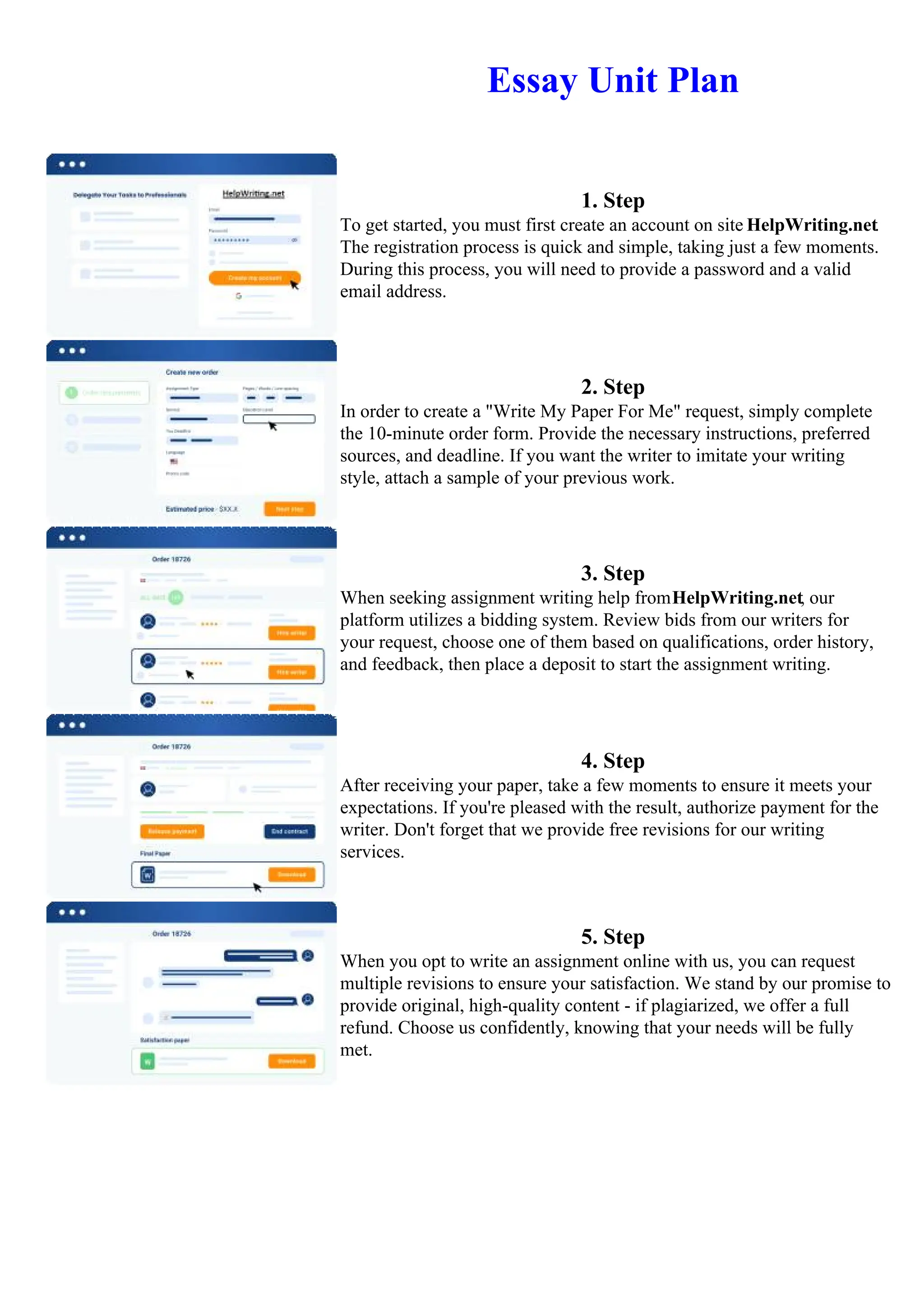 The document provides instructions for a 5-step process for requesting and receiving an essay written by a writer on the HelpWriting.net site. The steps include creating an account, completing an order form with instructions and deadline, reviewing writer bids and choosing a writer, receiving the paper and authorizing payment or requesting revisions.