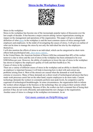 The document discusses workplace stress, its causes, and possible management strategies. It highlights the significant impact of stress on employee turnover and organizational costs, estimating stress-related costs at over $300 billion yearly in the U.S. The essay emphasizes the importance of understanding stressors and implementing effective management techniques to improve employee well-being and productivity.