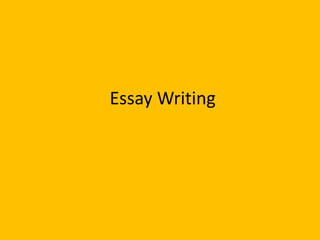 This document provides an outline for writing essays, including the origin of the word "essay", the basic components and types of essays, and tips for getting started. It discusses the French and Japanese origins of the word, defines an essay as a short piece telling one's thoughts on a subject. The three basic types of essays are described as descriptive, argumentative, and narrative. Key parts of an essay include an introductory paragraph, body paragraphs with opinions and justifications, and a conclusion. Quality writing is emphasized as the most important aspect.