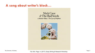 The document outlines an essay writing and research workshop at the University of Sydney, emphasizing the importance of writing as a form of social communication and a means for achieving academic clarity. It discusses key components of essay writing, including argumentation, structure, and the integration of theory and evidence, while providing examples of effective writing practices. The workshop includes activities aimed at assessing and improving students' writing skills, particularly in relation to constructing convincing arguments and adhering to proper referencing styles.