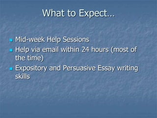 This document provides an introduction to writing expository essays for a week 1 writing course. It discusses the purpose of expository essays as conveying information about a subject factually and without opinion. Various brainstorming techniques are introduced to help writers generate and organize ideas for an expository essay, including freewriting, listing, considering multiple perspectives, and questioning formats like cubing and journalistic questions. Students are then prompted to practice brainstorming using provided online resources and assistance.