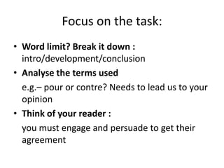 This document provides tips for writing an effective essay. It recommends breaking the essay down into an introduction, body, and conclusion to address the word limit and terms of the prompt. When drafting, the writer should collect strong vocabulary and structures and organize them into relevant paragraphs, combining or removing ideas as needed. An engaging introduction should set the scene and lead to the writer's opinion. Ideas should be clearly linked throughout with no new information in the conclusion. The document stresses the importance of reading and reviewing the essay critically to check focus, sense, and mechanics.