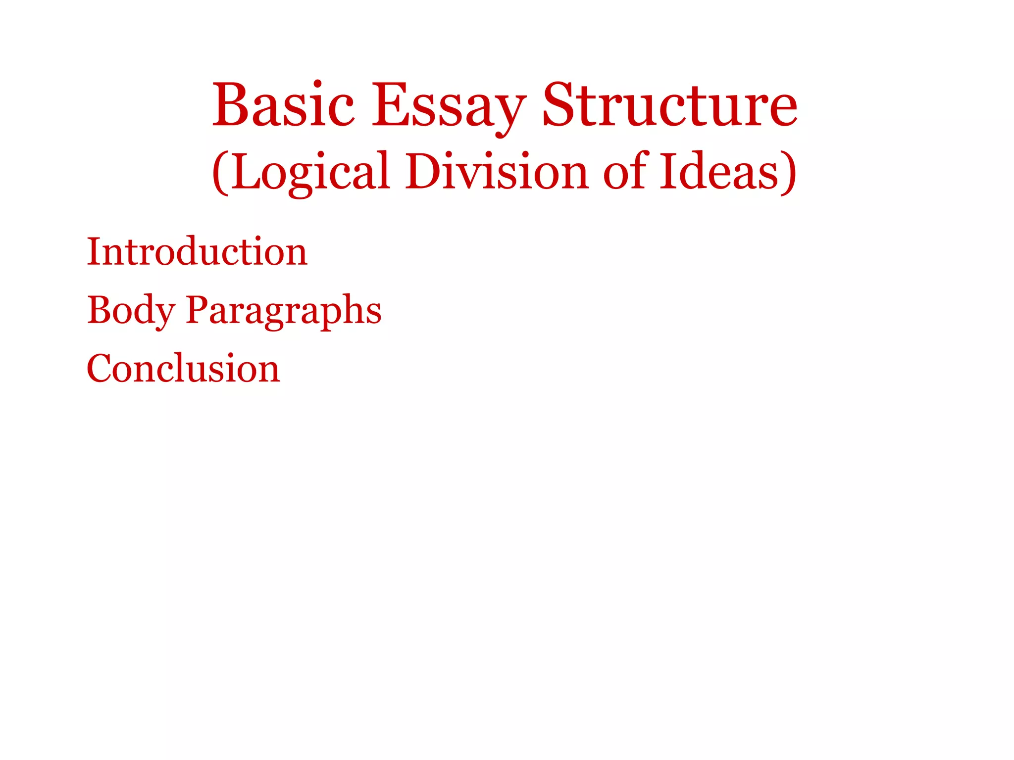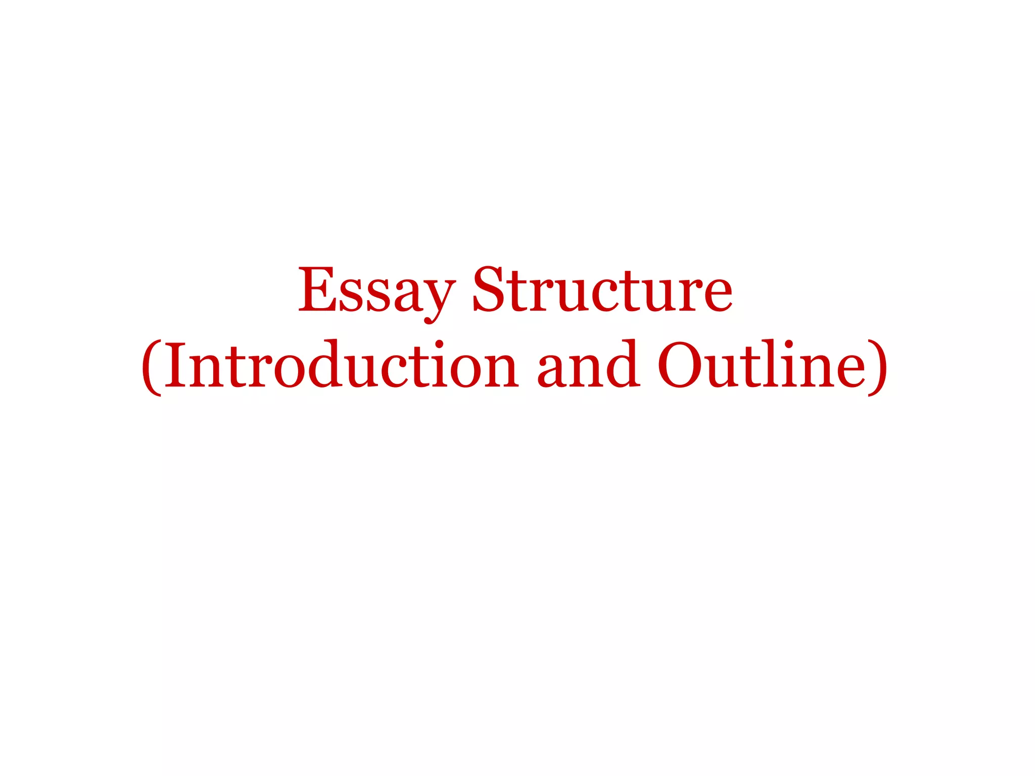 The document provides guidance on essay structure, including introducing topics with a funnel or attention-grabbing introduction, crafting a clear thesis statement that indicates the scope and organization of the essay, and using logical paragraph divisions and transitions between ideas. A good thesis states the main topic and previews subtopics to be discussed in each paragraph in a concise, specific manner rather than making broad announcements or stating obvious facts. Proper structure helps guide the reader through the argument.