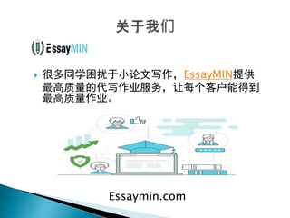 essaymin.com 提供代写服务,帮助学生高质量完成小论文和其他学术作业。服务包括演讲稿、商业计划书、奖学金论文等,旨在满足客户的学术需求。