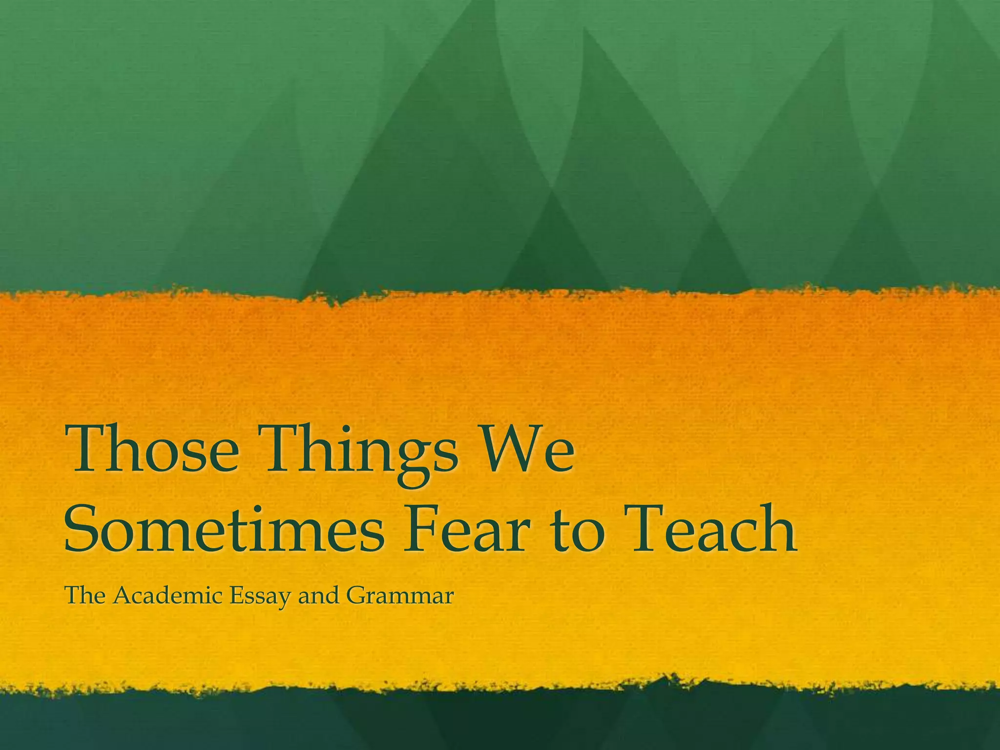 This document provides an overview of teaching grammar and the academic essay. It discusses research showing that traditional grammar instruction has little impact on writing quality and can be harmful. However, grammar can still be taught to expose language ideas and broaden students' language registers and tools for writing. The document also discusses alternatives to traditional essays, such as RAFTS writing. It addresses balancing concerns over correctness with supporting student expression and diversity in language use.