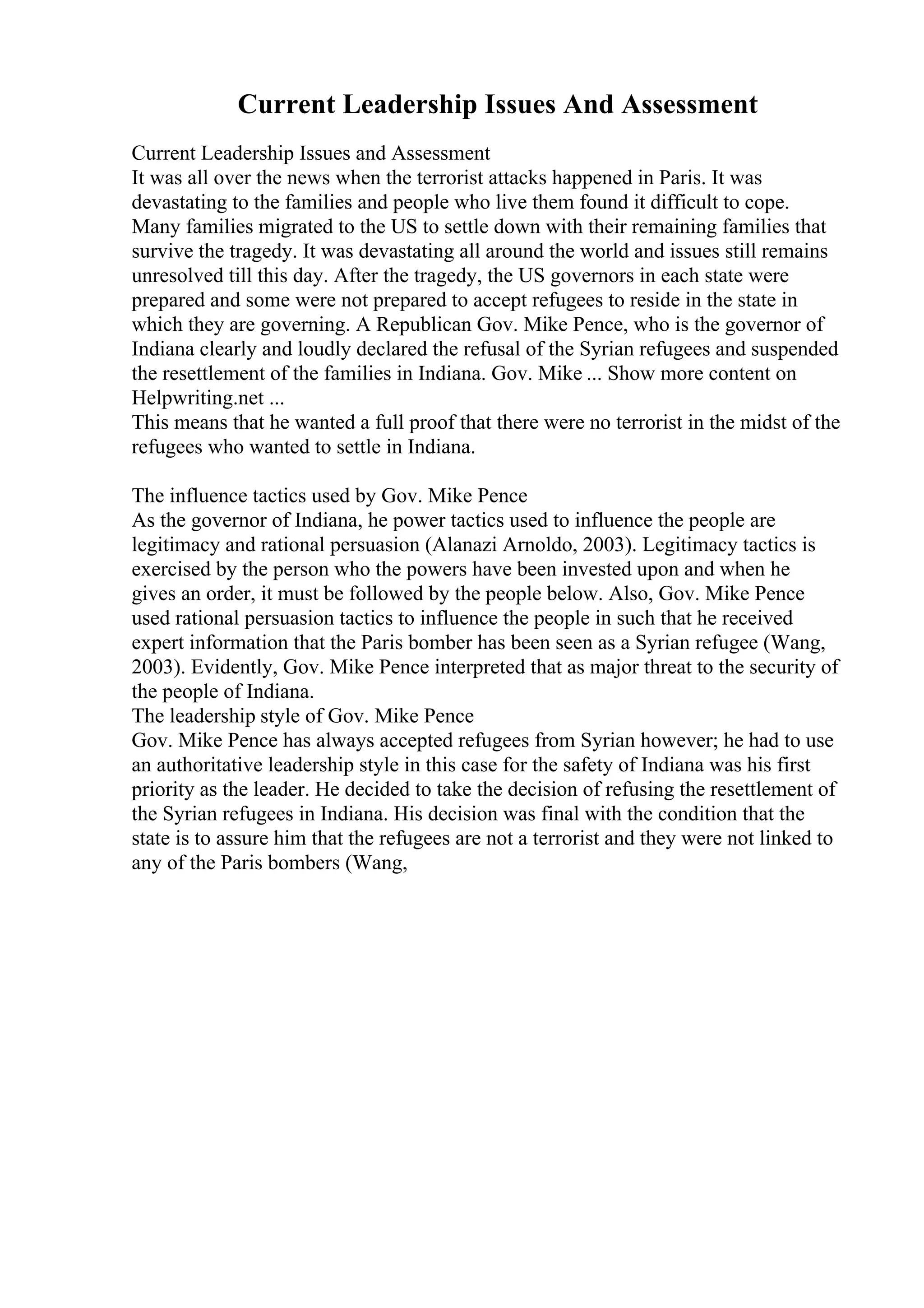 The document discusses the complexity of writing essays on ambition, highlighting the need for thorough research, a coherent thesis, and the ability to address the multifaceted nature of ambition from various perspectives. It also briefly touches on issues of leadership, particularly focusing on Governor Mike Pence's response to Syrian refugees in Indiana post-Parris attacks, indicating the use of authoritative leadership styles and rational persuasion in his decision-making. Lastly, the document explores personal narratives and historical figures related to ambition and leadership, while illustrating the challenges faced by individuals in different contexts.