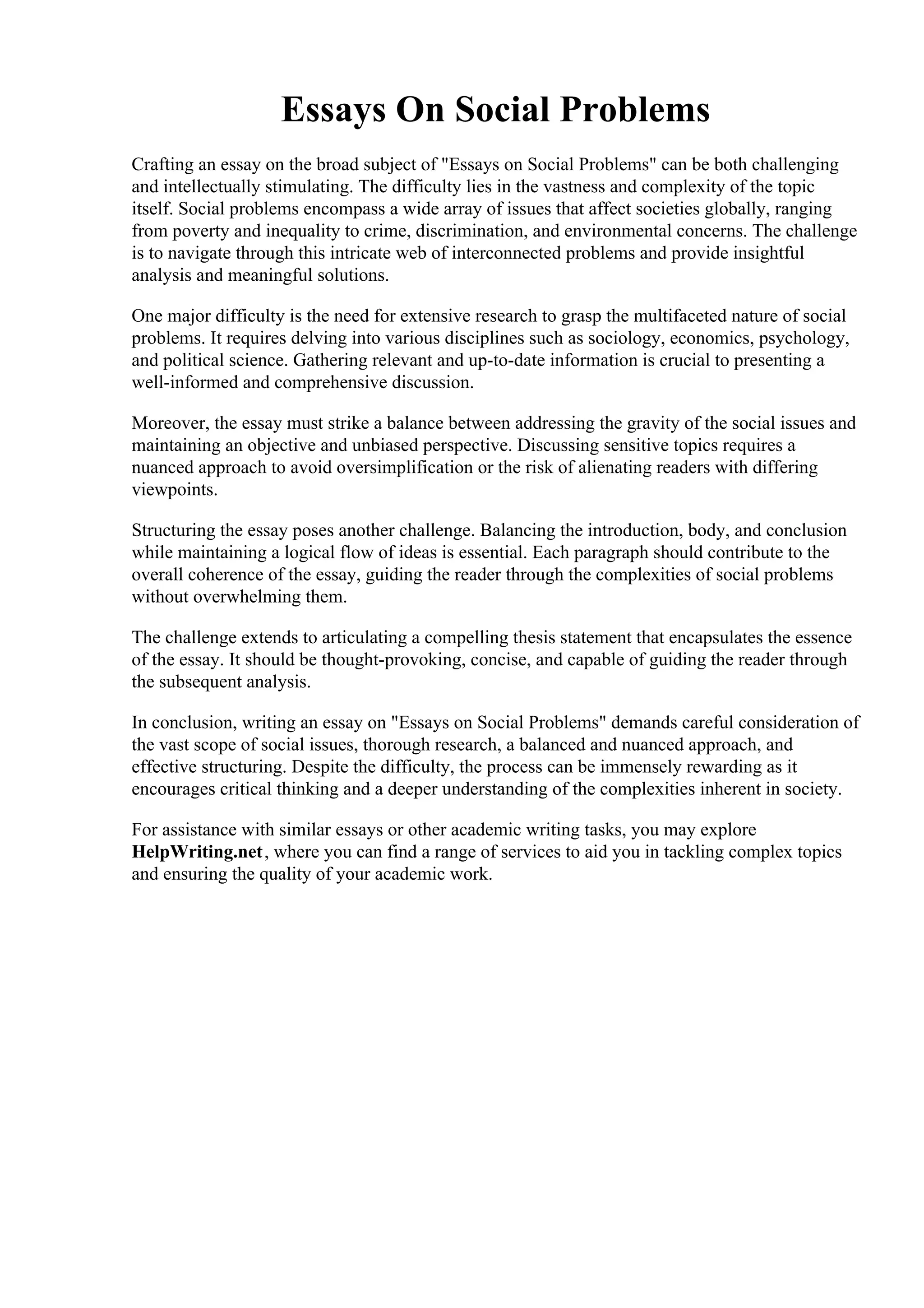 The document discusses the complexity of writing essays on social problems, highlighting the necessity for thorough research and a balanced, nuanced approach to effectively address sensitive topics. It also mentions the importance of structuring an essay coherently and crafting a compelling thesis statement. Overall, despite the challenges, the process is presented as a rewarding opportunity for critical thinking and understanding societal issues.