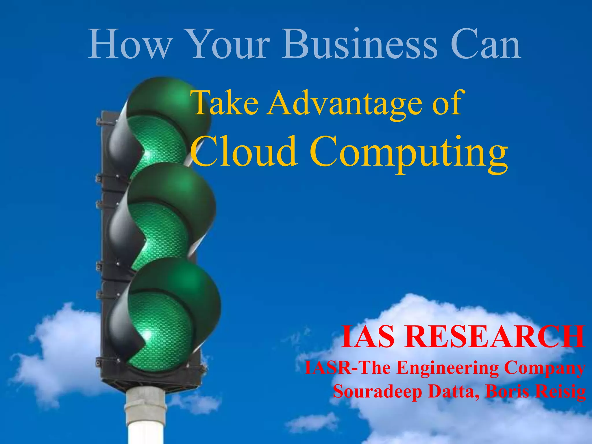 Cloud computing allows businesses to take advantage of elastic, on-demand computing resources and pay only for what they use. It provides businesses with cost savings, flexibility, scalability and high availability compared to maintaining their own on-premise IT infrastructure. The document discusses various cloud computing services including compute, storage, databases and others. It provides examples of how businesses can use these services to scale their operations more efficiently. Finally, it addresses some common concerns around security and privacy when using cloud platforms.