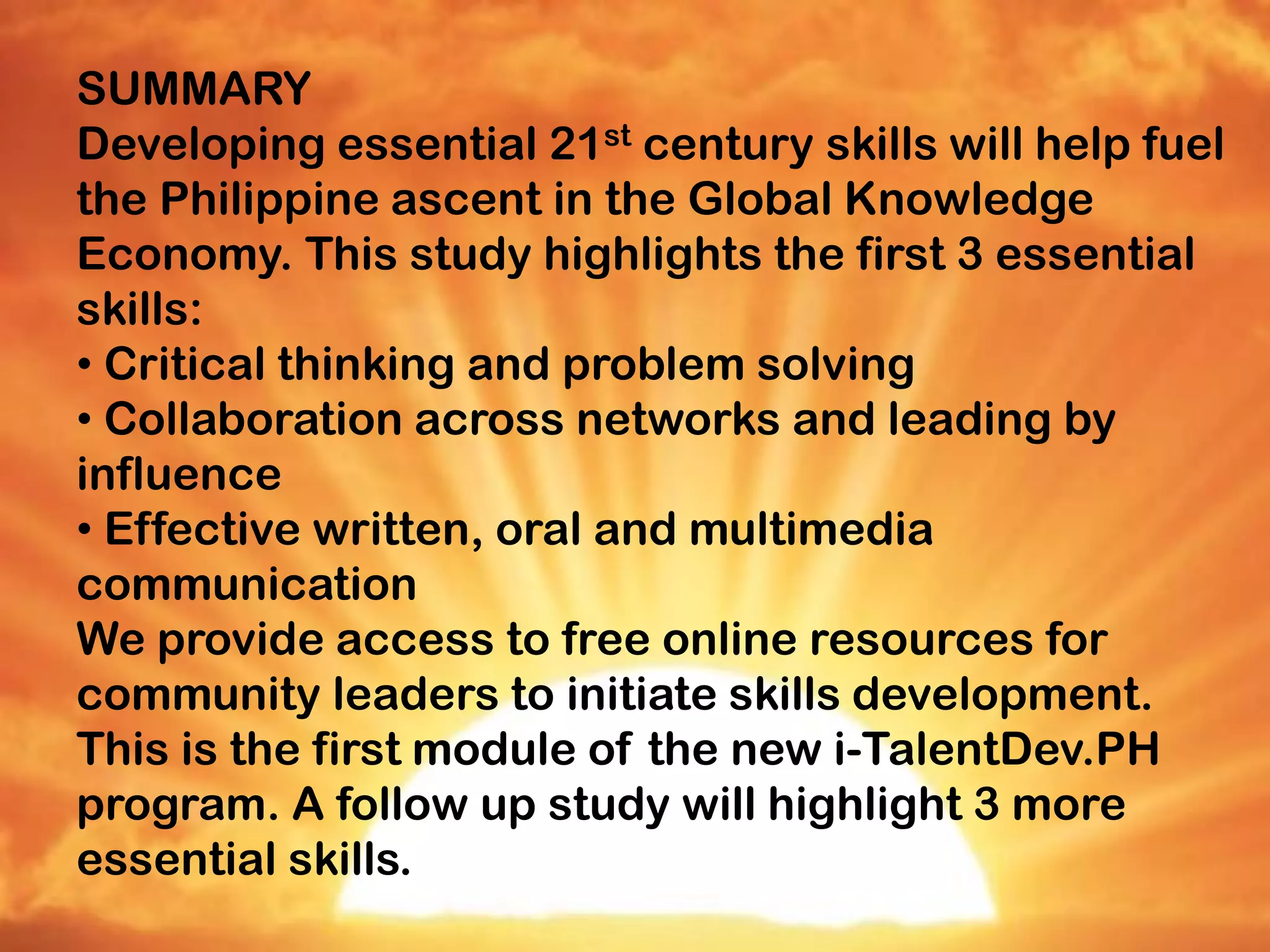 The document discusses developing 21st century skills to help fuel the Philippine ascent in the global knowledge economy. It identifies the first 3 essential skills as critical thinking and problem solving, collaboration across networks and leading by influence, and effective written, oral and multimedia communication. The study is the first part of a new i-TalentDev.PH program that will highlight additional essential skills in future modules.