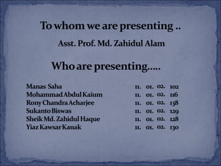 The Essential Commodities Act of 1957 in Bangladesh provides the legal framework to control prices and regulate trade of essential commodities. It gives the government powers to license manufacturers, control prices of buying and selling, prohibit hoarding, regulate commercial transactions, and require persons involved in production and distribution to maintain records. Offences under the act are punishable with imprisonment up to 3 years or fines or both. The act protects legal actions taken by the government and its officers in good faith according to orders issued under the act.