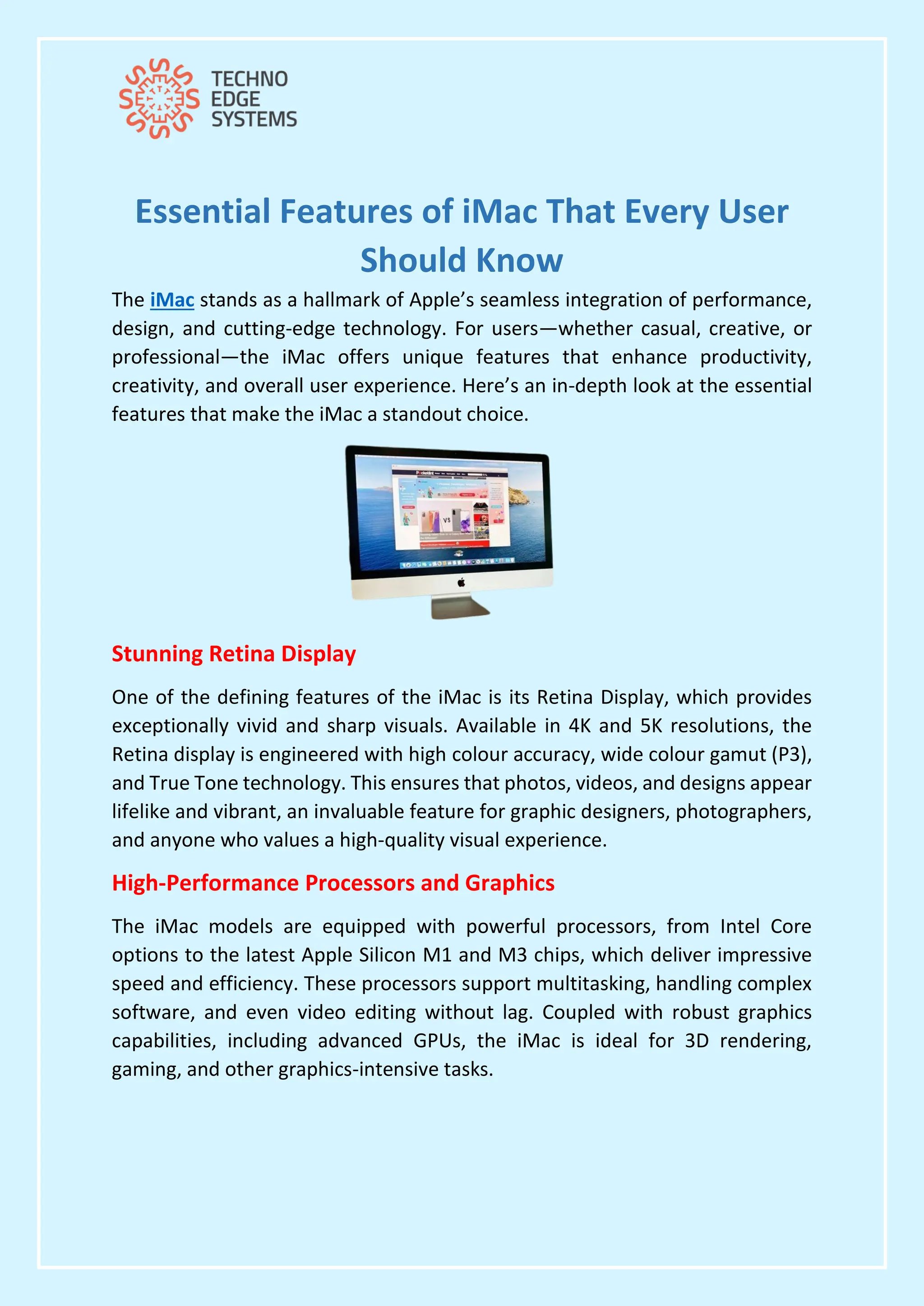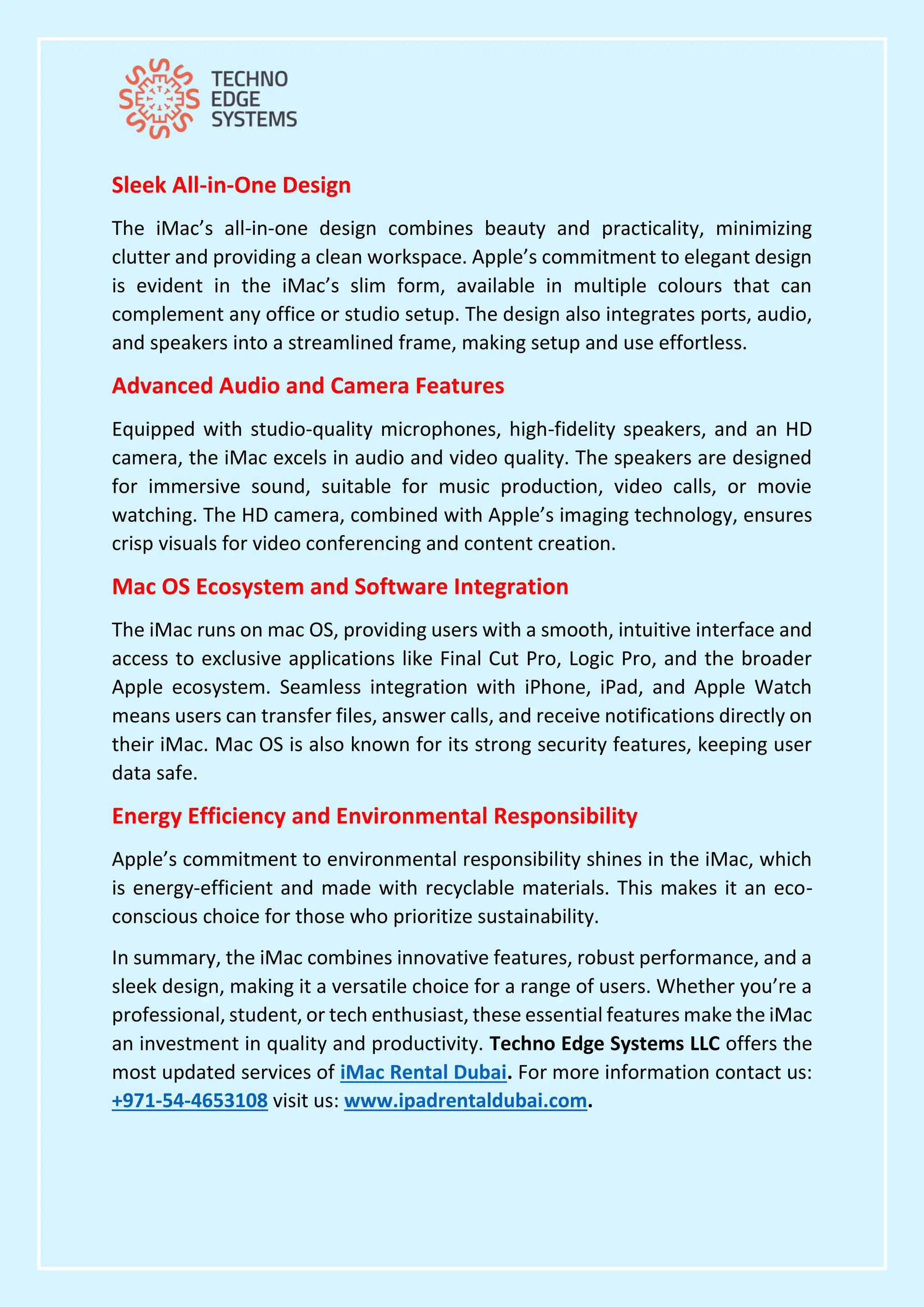 In this Blog, We are going to explain essential features of iMac that every user should know. Techno Edge Systems LLC offers the best services of iMac Rental Dubai. For more info contact us: +971-54-4653108 visit us: https://www.ipadrentaldubai.com/imac-rental-dubai/