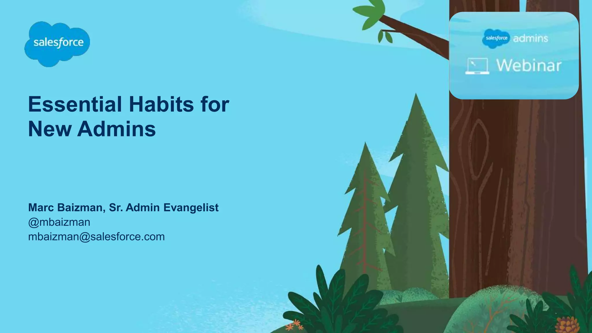 1) The document outlines essential habits for new admins, including calendars of habits for core admin responsibilities like user management, data management, security, and actionable analytics.