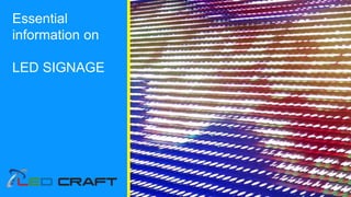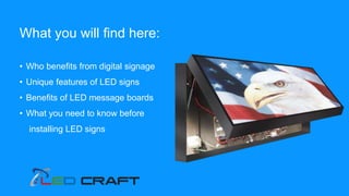 The document provides an overview of digital signage, specifically focusing on the benefits and unique features of LED signs across various sectors including retail, education, healthcare, and government. It outlines the advantages of LED message boards, such as increased brand awareness and enhanced communication, and offers considerations for installation, including audience identification and content management. Overall, it highlights the significance of LED signage in improving information dissemination and engagement in diverse environments.