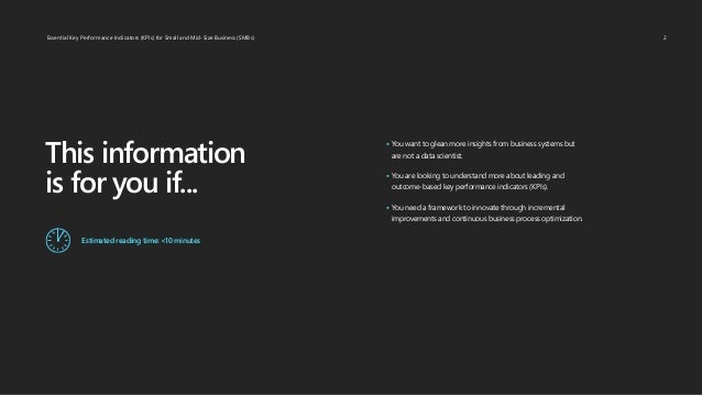 This document outlines essential key performance indicators (KPIs) for small and mid-size businesses (SMBs) to enhance adaptability, productivity, and overall performance in a rapidly changing market. It emphasizes the importance of measuring both leading and lagging KPIs to facilitate continuous business process optimization and innovation. Additionally, it discusses the role of tools like Microsoft Dynamics 365 Business Central in helping SMBs track these metrics effectively.