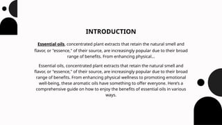 This beginner's guide to essential oils highlights their benefits for physical wellness and emotional well-being through practices like aromatherapy. It details effective methods for utilizing essential oils, including diffusers, direct inhalation, and skin application, while also touching on safety tips and popular oils for beginners. The document encourages new users to explore the diverse applications of essential oils to enhance their quality of life.