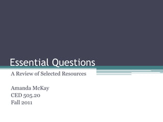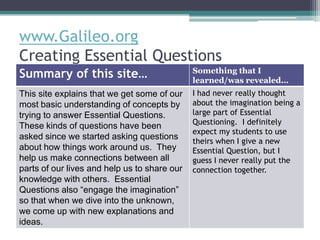 This document provides a summary of several resources on essential questions. The summaries highlight that essential questions engage student imagination, help make connections between concepts, and require deeper investigation beyond single answers. However, the documents also reveal that essential questions are sometimes harder to write for science subjects compared to other disciplines. Overall, the resources emphasize that essential questions promote deeper learning when they encourage students to ask their own questions and work collaboratively to find multiple perspectives on a topic.