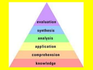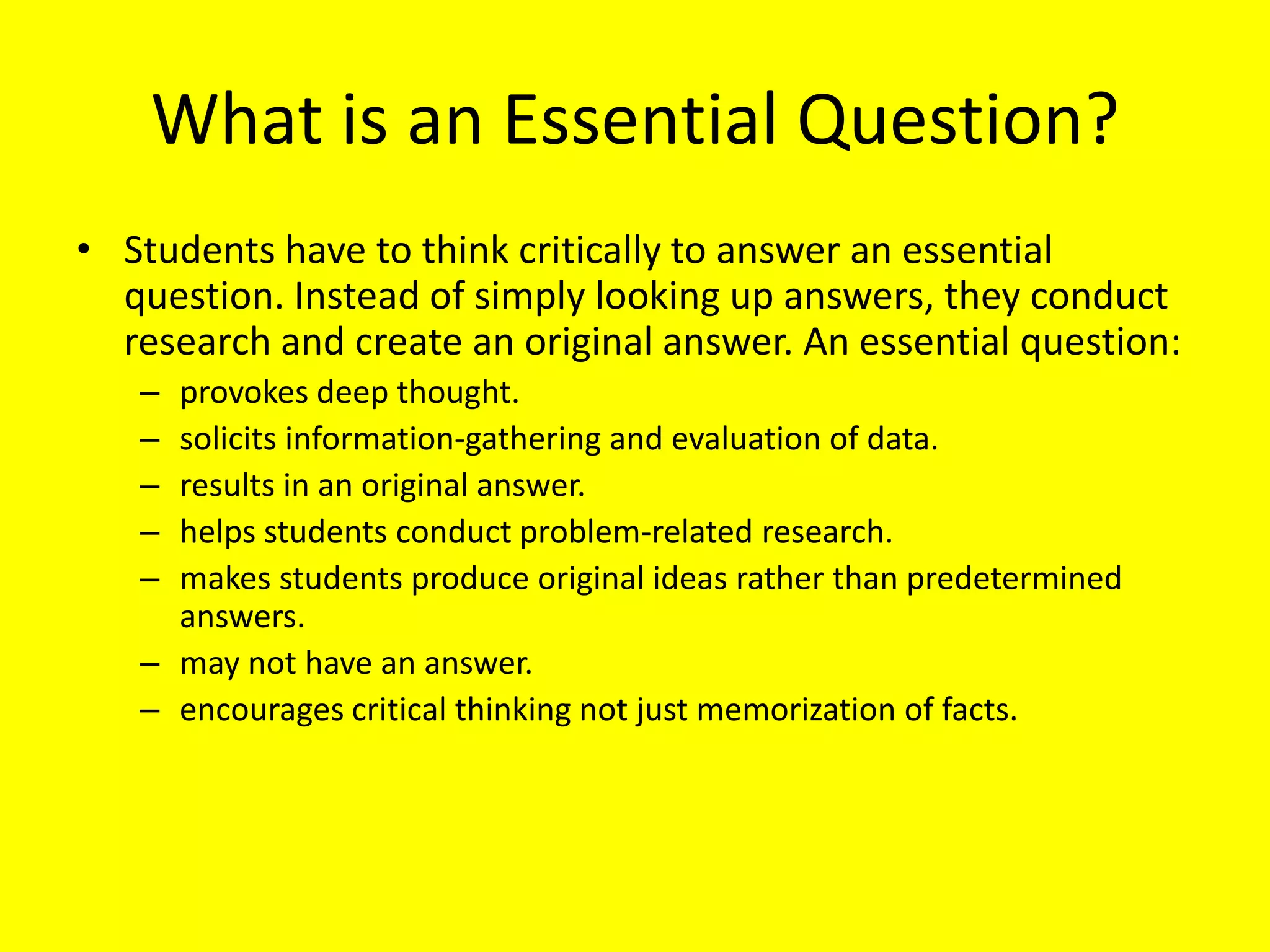 The document provides guidance on how to write an essential question. It explains that an essential question should provoke critical thinking rather than have a predetermined answer. It should require students to synthesize, analyze, and evaluate information from multiple sources. The document also discusses Bloom's Taxonomy and Webb's Depth of Knowledge model, noting that essential questions are found at the higher levels of these frameworks. It provides examples of effective essential question wording and distinguishes essential questions from traditional fact-based questions.