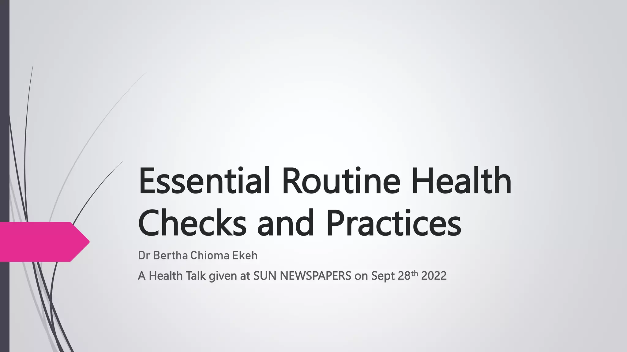 Dr. Bertha Chioma Ekeh's health talk emphasizes the importance of routine health checks, disease screening, and lifestyle modifications for enhancing health and preventing disease. Key topics include cancer screenings for prostate, breast, and cervical cancers, as well as the importance of early detection and the impact of lifestyle choices on overall health. Effective health promotion strategies are highlighted, including immunizations, lifestyle counseling, and maintaining a healthy diet.