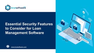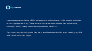 The document outlines essential security features for loan management software (LMS), emphasizing the importance of protecting sensitive financial data. Key features include multi-factor authentication, data encryption, data backup, point-in-time data restoration, redirecting HTTP to HTTPS, column-level encryption, and real-time application insights. These measures collectively enhance security and mitigate risks of unauthorized access and data breaches.