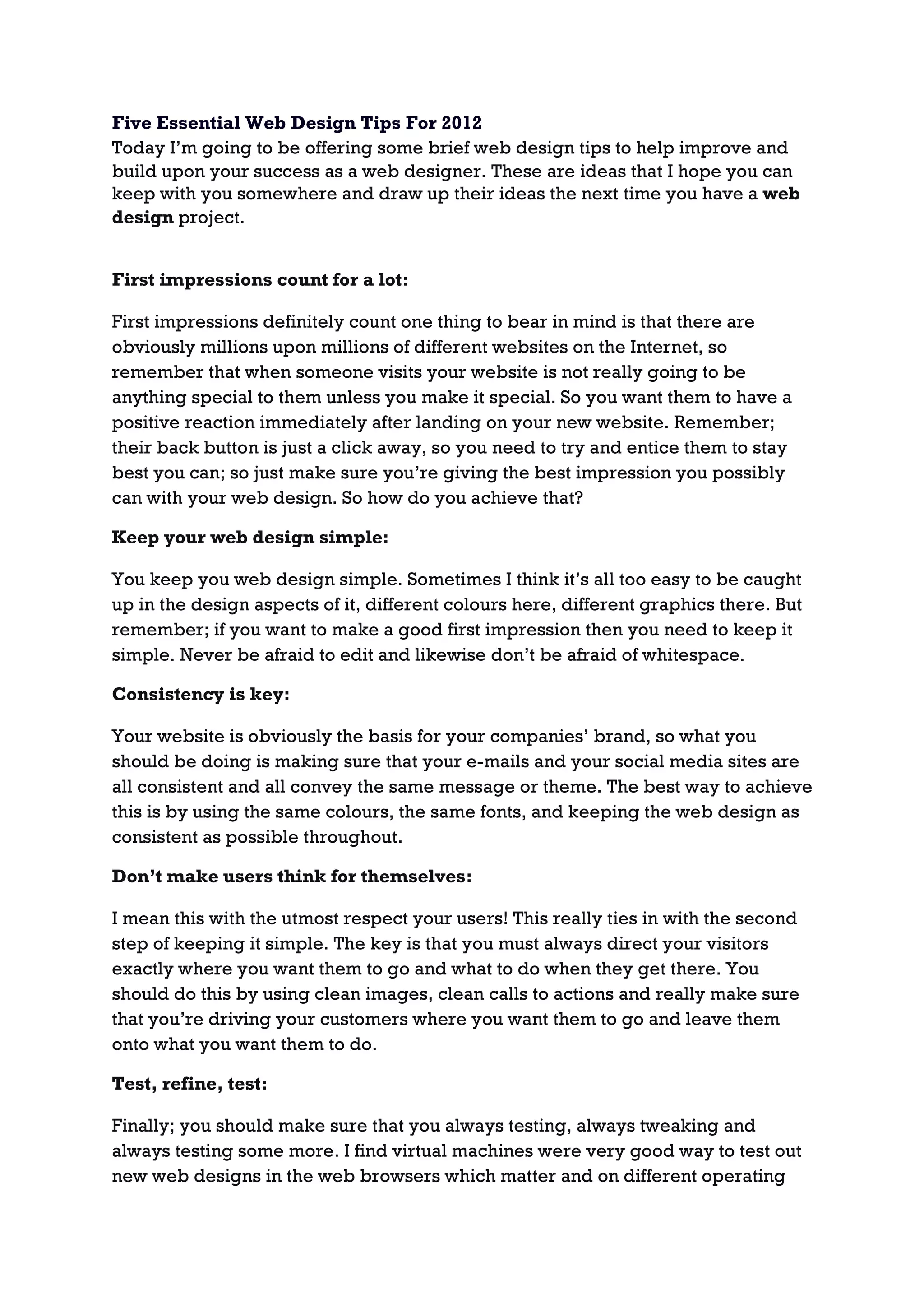 The document provides five tips for web design in 2012: (1) make a good first impression with your design by enticing users to stay on your site; (2) keep designs simple with minimal colors, graphics, and whitespace; (3) maintain consistency across websites, emails, and social media with common colors, fonts, and design; (4) clearly direct users where to go and what to do with clean images and calls to action; (5) continually test and refine your design using different browsers and operating systems to improve based on customer reactions.