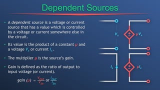 This document discusses dependent sources and operational amplifiers. It defines dependent sources as voltage or current sources whose value is controlled by another voltage or current in the circuit. Their value is the product of a constant gain and the controlling voltage or current. The document then discusses various op-amp configurations like inverting amplifiers, non-inverting amplifiers, summing amplifiers, and integrators. It explains how feedback is used to stabilize the op-amp and achieve a desired gain. The document also provides an overview of digital to analog converters and how they reconstruct analog waveforms from digital samples.