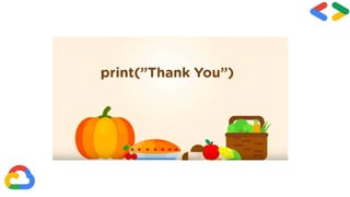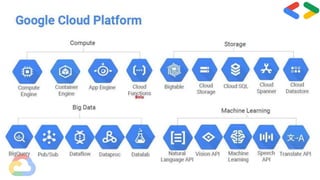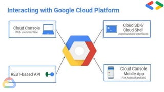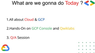 The document discusses Google Cloud Platform (GCP) and provides an introduction for getting started with GCP over 30 days. It defines cloud computing and explains that GCP runs on the same infrastructure as Google's internal products. The key products and services of GCP are then outlined, including compute, storage, databases, networking, big data, cloud AI, management tools, and security APIs. Advantages of using GCP are listed as higher productivity, less disruption during updates, ability to work remotely, quick collaboration, and more security through centralized data storage. Finally, it encourages getting started with the 30 days of hands-on GCP learning and Q&A.