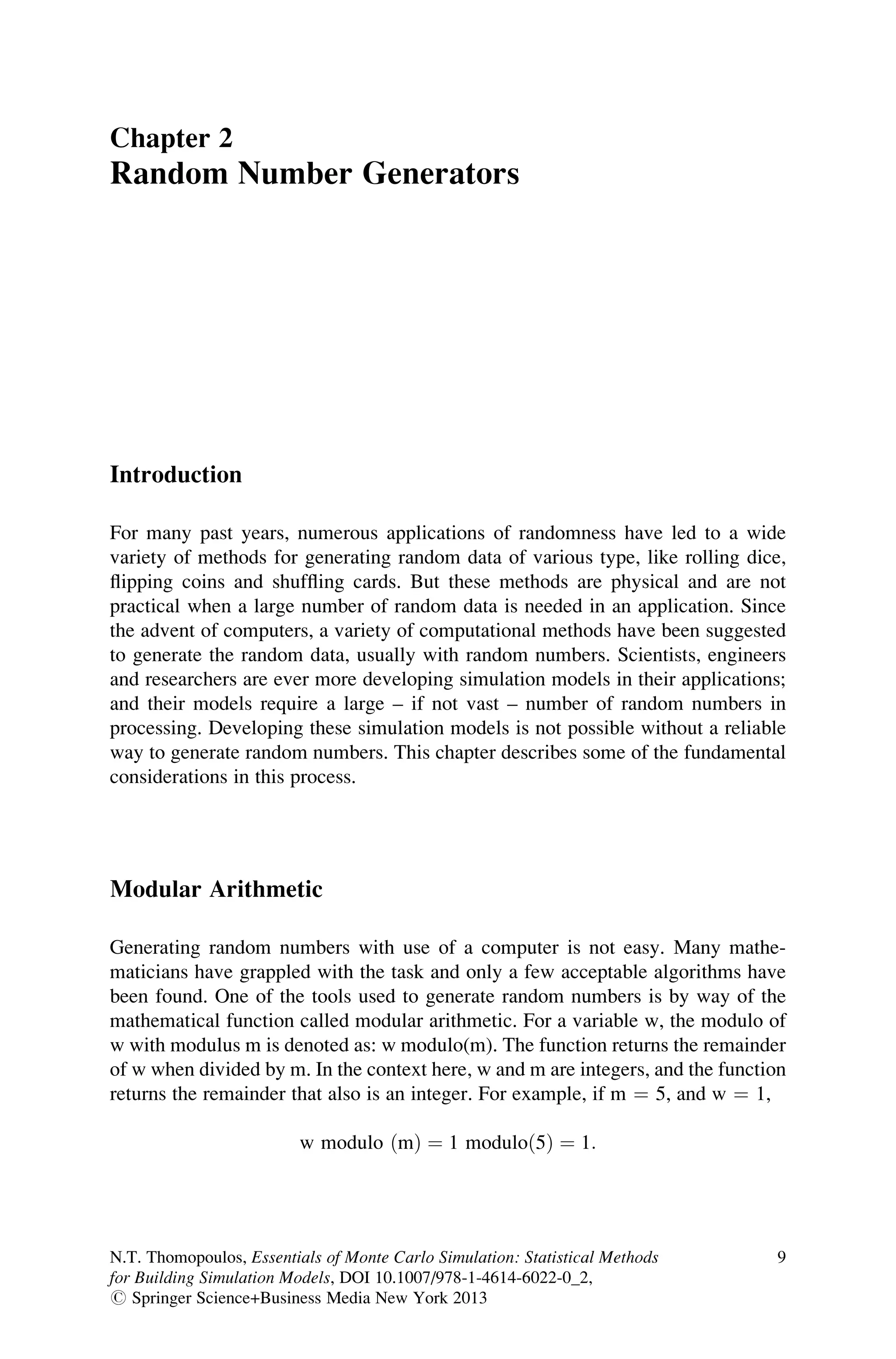 The document discusses random number generators and some methods for generating random numbers computationally. It introduces modular arithmetic and how remainders can be used to generate sequences of random integers. It then describes linear congruent generators (LCG), which were introduced in 1951 as a way to generate random numbers for computer applications using modular arithmetic. The document provides examples of LCGs and discusses considerations for using them such as cycle length and achieving a full cycle. It also discusses generating uniform random variates between 0 and 1 from the integer sequences and tests for evaluating random number generators.