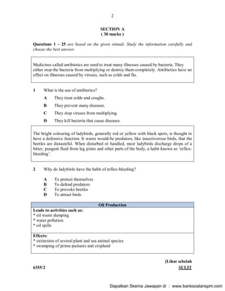 The document is an English exam paper for the Malaysian SPM (Sijil Pelajaran Malaysia) examination in 2010. It consists of 30 multiple choice questions testing knowledge of English for science and technology. The questions cover topics like antibiotics, plate tectonics, oil production, nanotechnology, and more. Instructions are provided to students to answer all questions by shading their responses on an objective answer sheet within the 1 hour time limit.