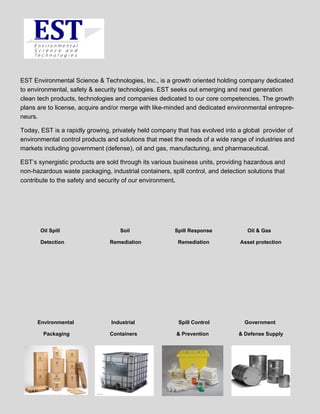 EST Environmental Science & Technologies, Inc. is a holding company that seeks to acquire and merge with environmental technology companies. It has grown into a global provider of environmental products and solutions through its subsidiaries, which provide services like hazardous waste packaging, spill control products, and detection solutions. The document discusses several of EST's subsidiaries that offer products for oil spill response, industrial containment, security and monitoring services, and sorbent materials.
