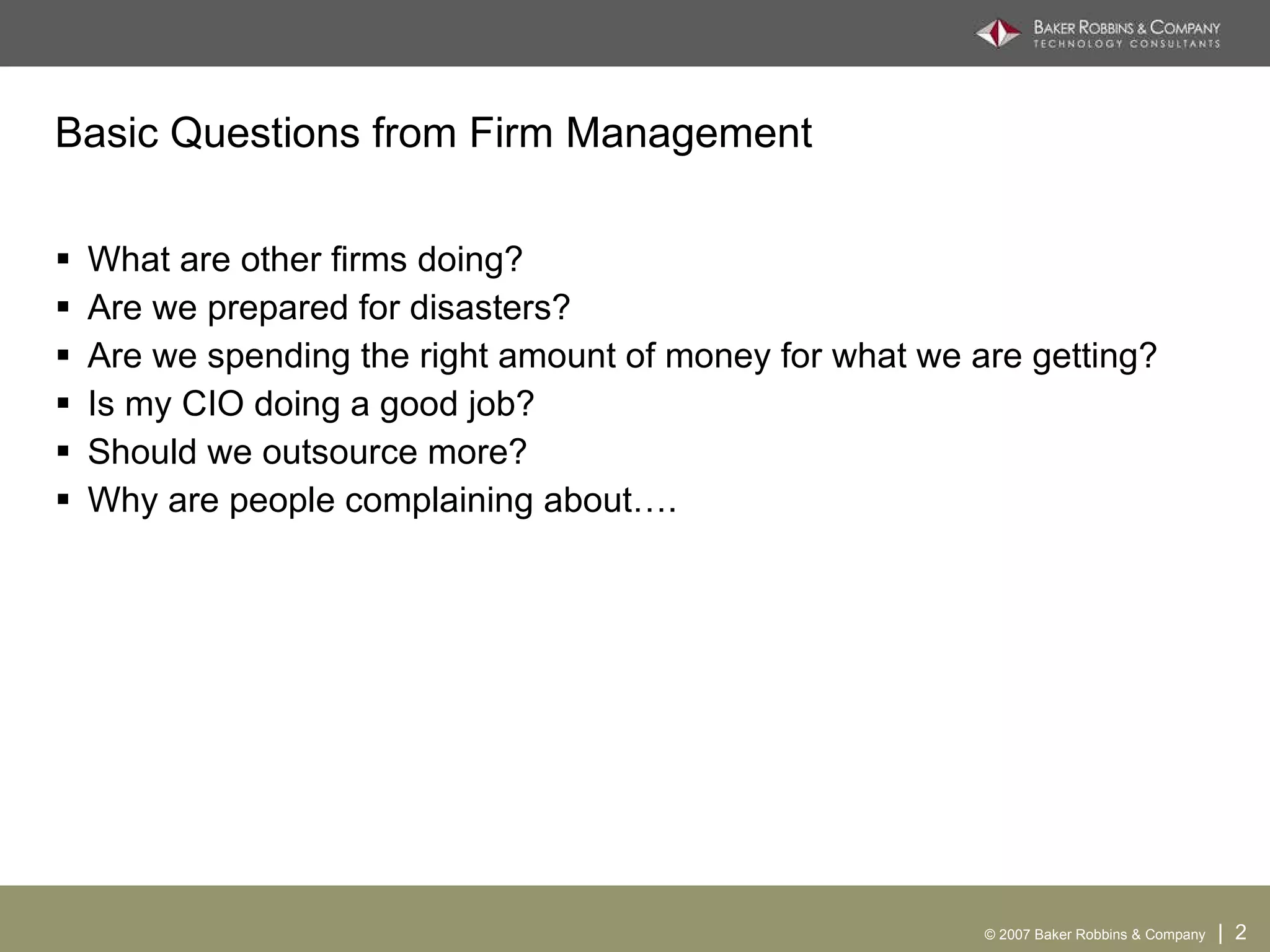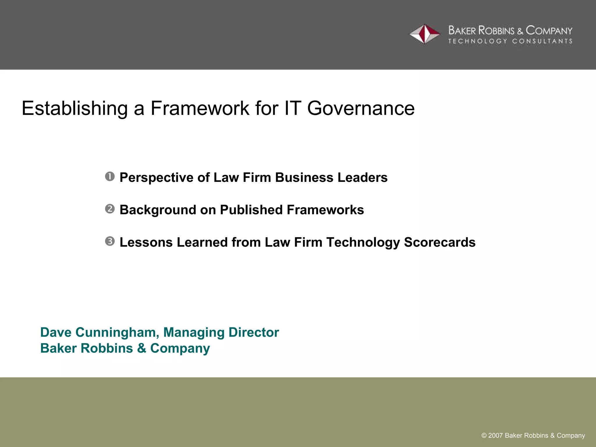 Establishing an IT governance framework is important for law firms to effectively manage IT resources, risks, and investments. Published frameworks provide guidance but also require customization for each firm. Assessing firm performance through metrics and benchmarks allows for continuous improvement.
