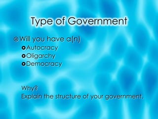The student has been shipwrecked on a deserted island with 100 classmates. They must work together to survive by building shelters, gathering food, and establishing routines. However, trouble arises as some students refuse to help and factions begin competing for resources. To prevent disaster, the student realizes they need to create a government to establish order and common purpose.