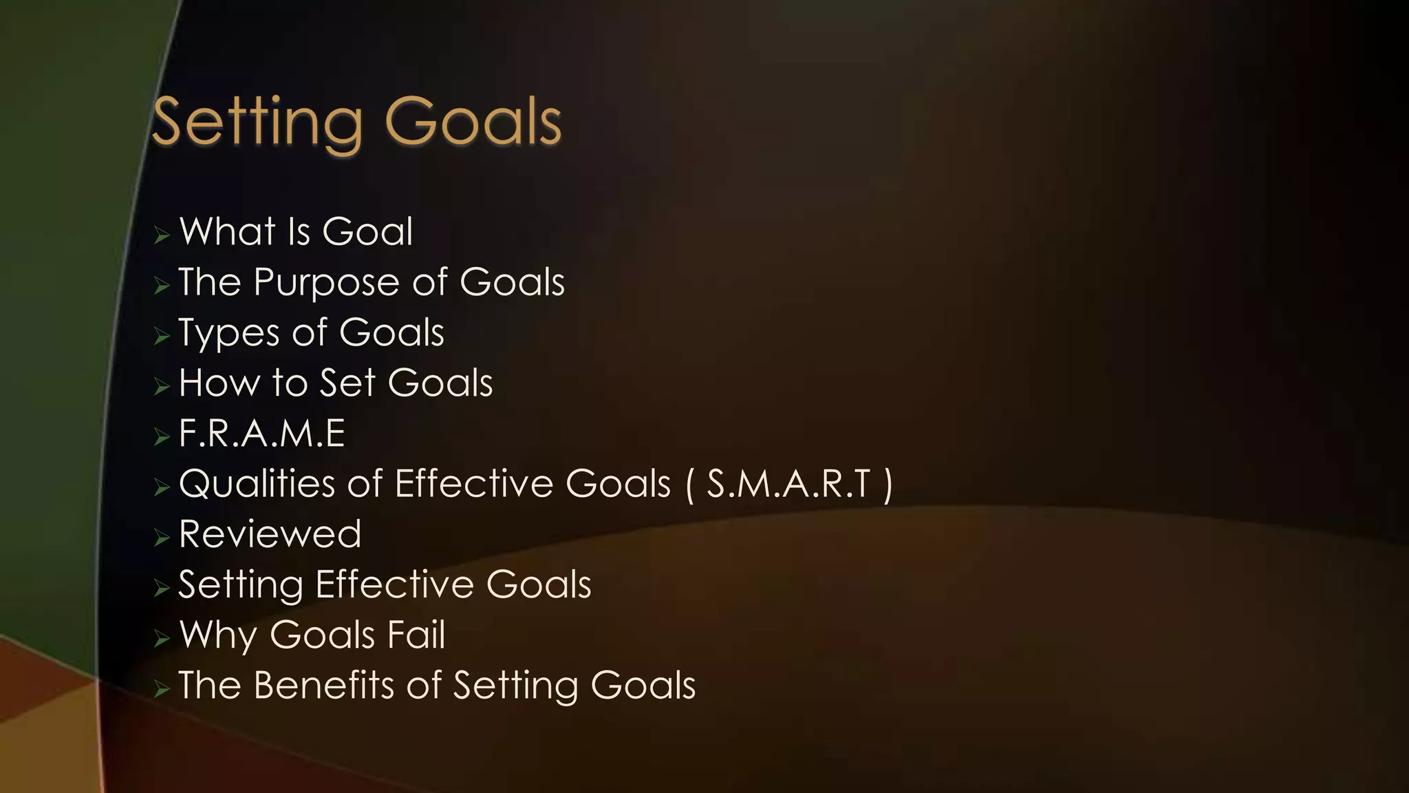 This document discusses the purpose and types of goals. It outlines the steps to set effective goals using the F.R.A.M.E. method and ensuring goals meet the S.M.A.R.T. criteria by being specific, measurable, action-oriented, realistic and tangible. Some reasons goals may fail are listed, as well as the benefits of setting goals such as suffering less stress, better concentration, more self-confidence and improved performance and happiness.