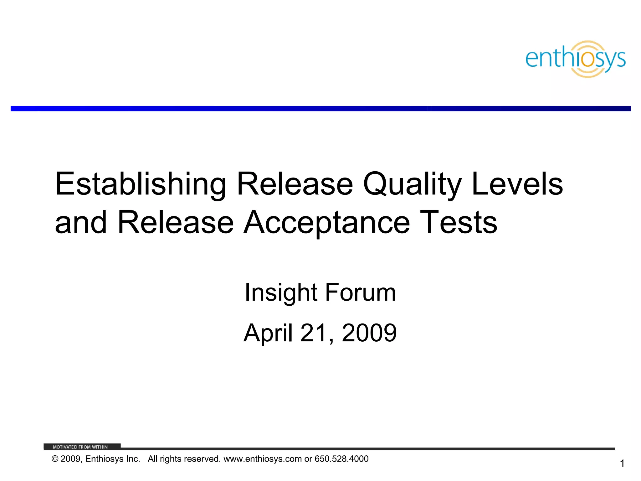 The document discusses establishing quality levels and acceptance tests for software releases, emphasizing the importance of aligning product quality with user requirements and business goals. It outlines various definitions of quality and introduces a framework for assessing release quality levels, including several examples. Additionally, the document highlights the role of acceptance tests in ensuring that releases meet predefined criteria, enhancing team confidence and facilitating better project outcomes.