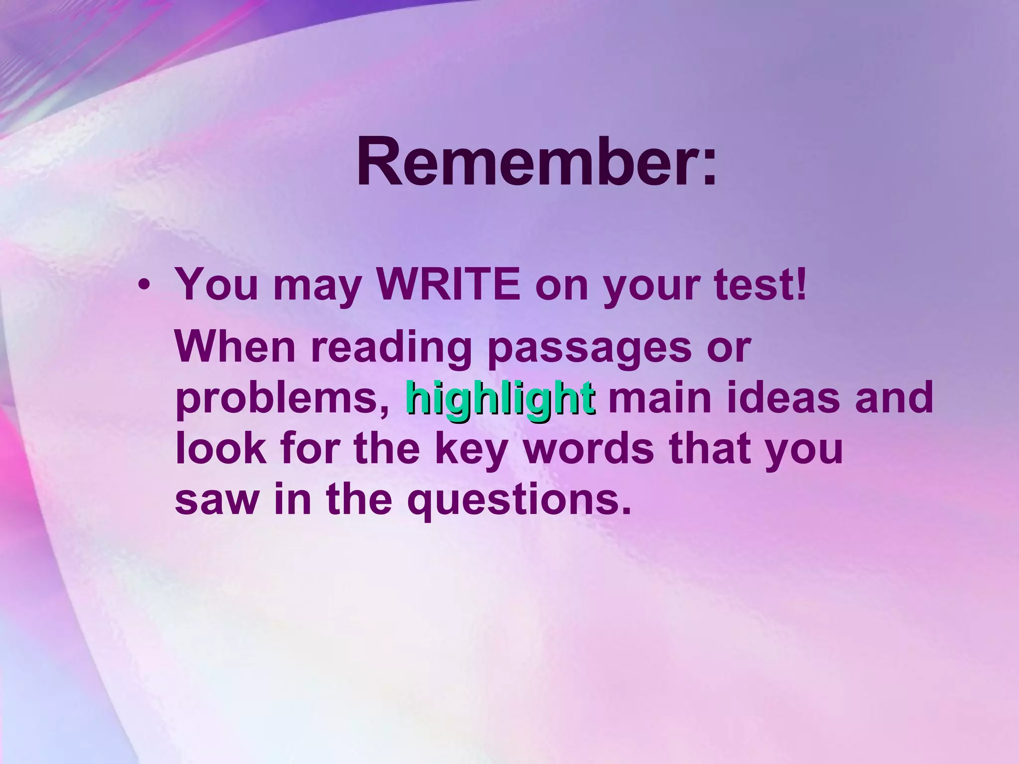This document provides strategies and tips for students taking standardized tests. It recommends highlighting main ideas, carefully reading directions, pacing yourself, using process of elimination, not randomly guessing, checking your work, and focusing on questions you're unsure of if time remains. It also provides tips for math problems like double checking copying and place value as well as general reminders to fill in bubbles fully and check your test number.
