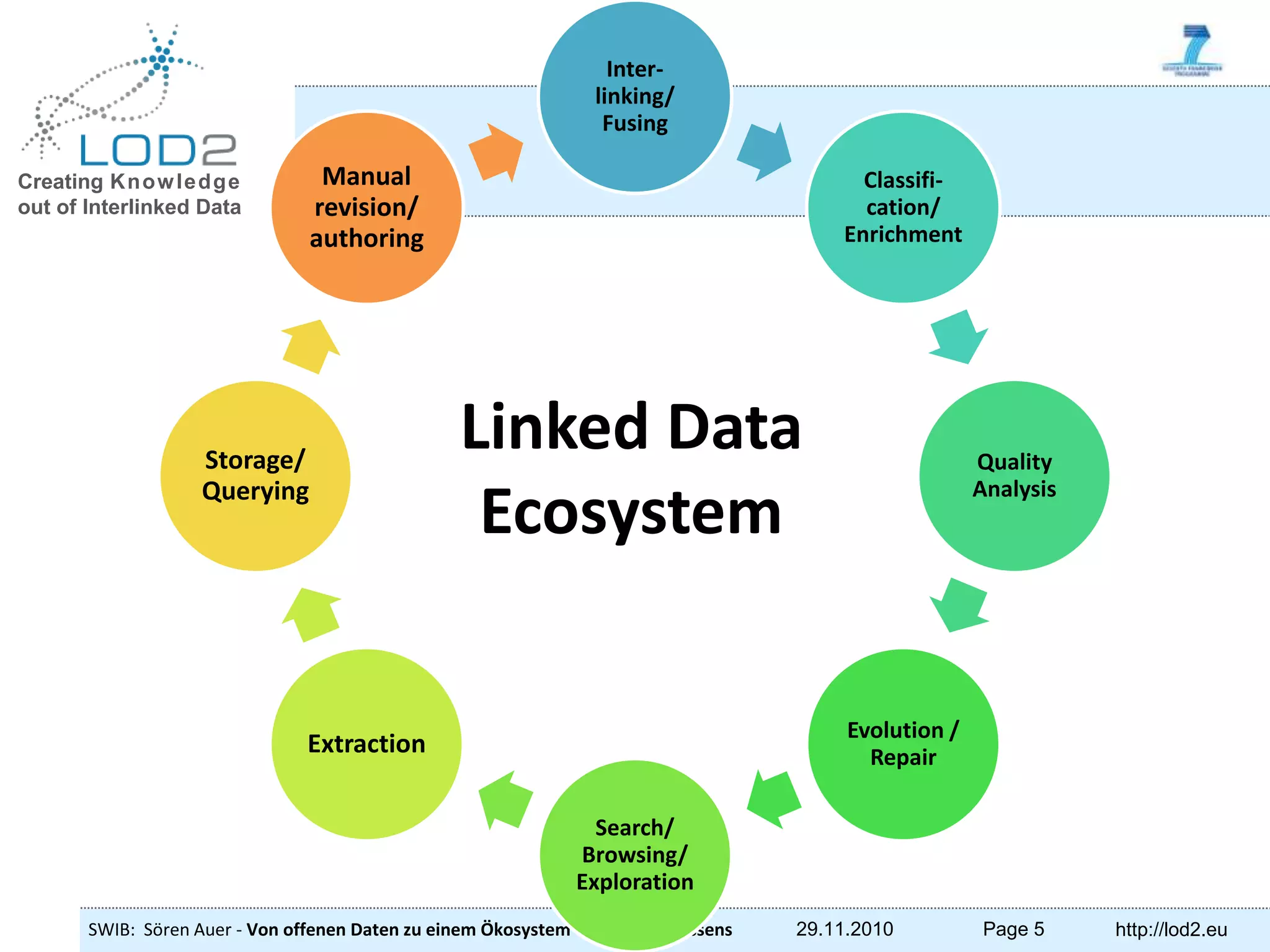 The document discusses the concept of linked enterprise data, which facilitates data integration across enterprises using a pragmatic and incremental approach. It highlights achievements in the linked data ecosystem, including the extension of the web with a data commons and industrial adoption, alongside challenges like data quality and usability. The text also mentions partnerships and focus areas for research and development in linked data management.