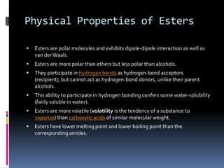 Esters are polar molecules that can participate in hydrogen bonding and dipole-dipole interactions. They are more polar than ethers but less polar than alcohols. Esters have lower melting and boiling points than the corresponding acids and amides. They undergo hydrolysis under basic conditions and are relatively resistant to reduction compared to ketones and aldehydes. Esters are commonly used as solvents, plasticizers, and food flavorings.